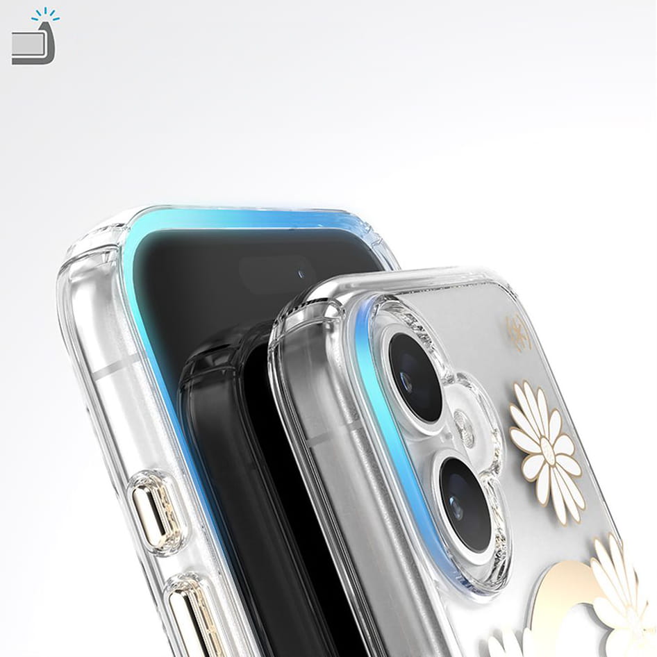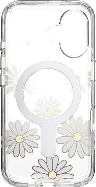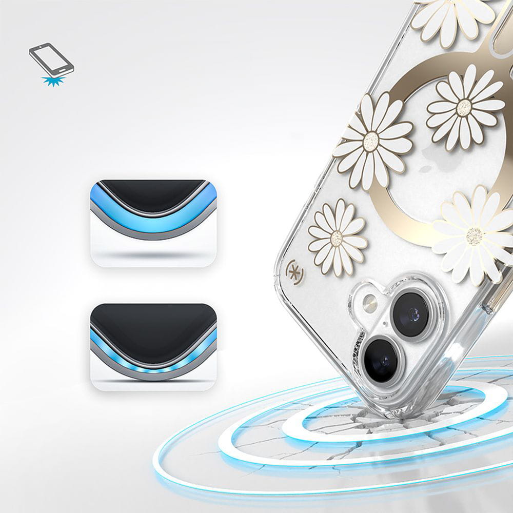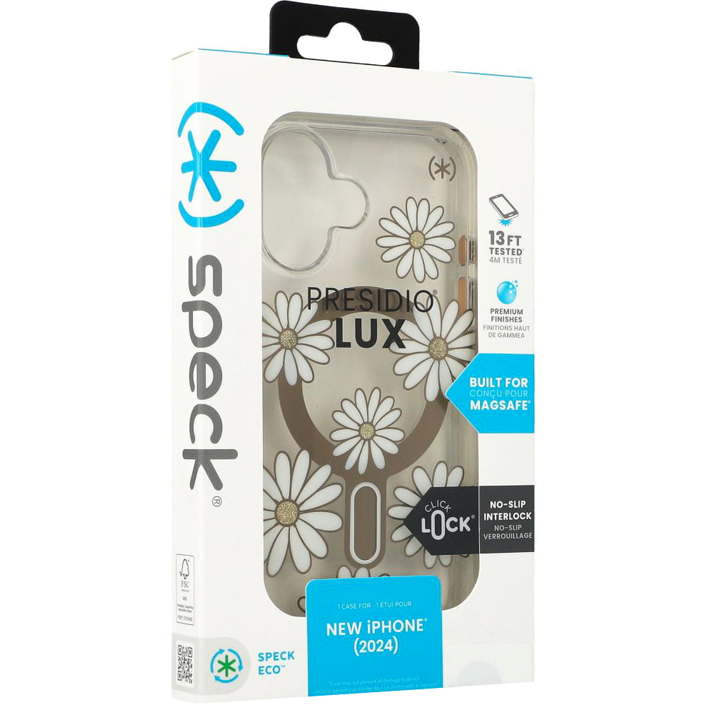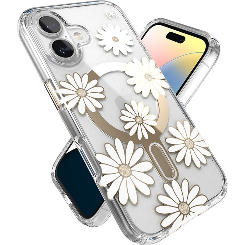 The Speck Presidio® Lux ClickLock & MagSafe® with ClickLock™ Interlock anti-slip technology is a transparent case with a built-in magnet, compatible with Apple MagSafe® accessories. Decorated with a floral motif (daisies) with gold accents, it gives the device a unique look.