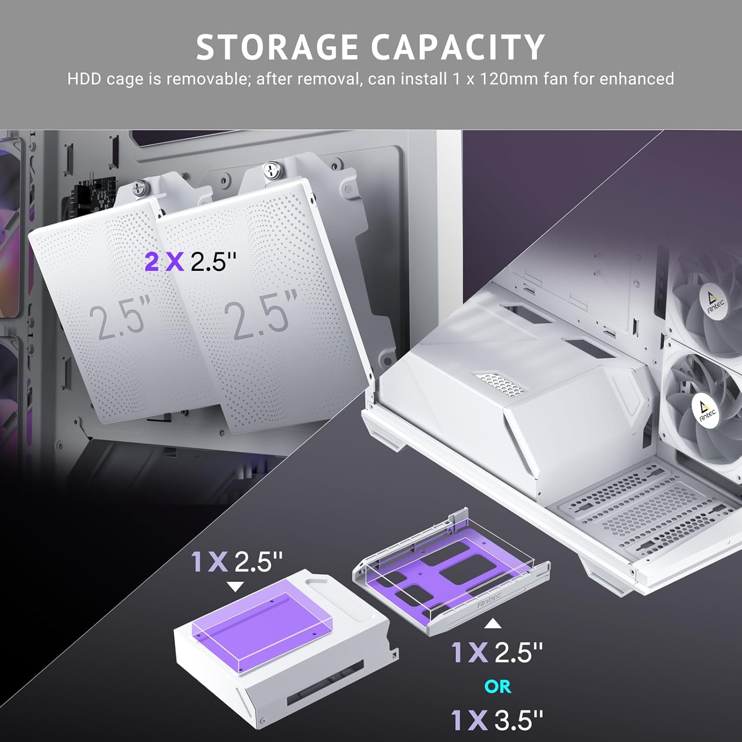 - Removable HDD Cage: Can be removed for installing 1x120mm fan.