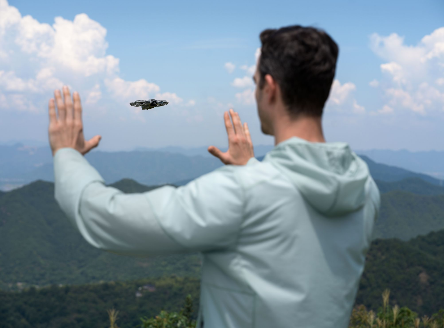 DJI Neo 2 features an onboard display for intuitive shooting mode selection. To launch, point it at yourself and press the takeoff button with one hand to take off directly from your palm, then perform automatic camera movements. The new Return-to-Palm feature allows Neo 2 to precisely locate your palm, return safely, and land steadily, making flights easier than ever.