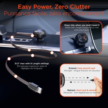 Just pull the cable out and plug it into your device, then let the cable automatically retract when you’re done – keeping your center console free and clear of any messy, tangled-up cables. With a second 30W USB-C PD port, you can super-fast charge two devices side-by-side – and with an additional 18W USB port, you can turn your dashboard into a multi-device charging hub for 3 devices at the same time with up to 60W total output.