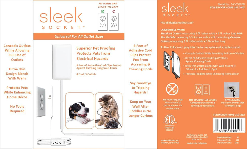Sleek | Socket Ultra-Thin Pet Proofing Outlet Cover with 3 Outlet Power Strip and Protective Cord 8FT | 9-P-OVSZ-W9-P-OVSZ-W